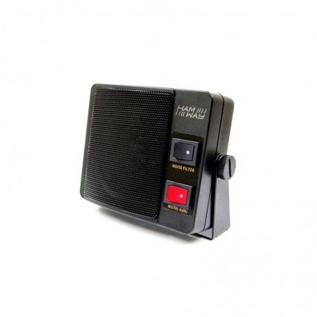 Altavoz auxiliar para equipos CB y similares. Especial para base. Soporte inclinable incluido. Acepta hasta 4 Watt. Impedancia 8 Ohm. Longitud cable 3.5m con clavija mono de Ø 3.5mm acodada 90º. Incluye filtro ruido y mute.